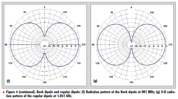 One example is shown in Figure 4. In Figure 4(a), the first resonance of a Koch dipole is at 961 MHz while that of a regular dipole with the same length is at 1851 MHz. Therefore, the length of the antenna is reduced by a fact of the 1.9. The current distribution and radiation patterns for both the Koch dipole and the regular dipole at the resonant frequencies are shown in Figure 4(b)-(f). It is worth mentioning that the radiation pattern of a Koch dipole is slightly different from that of a regular dipole because its fractal dimension is greater than 1.Koch loop and Minkowski loop— The Koch curve canalso be used to form a loop of reduced size. Another example is the Minkowski loop formed with a 90-degreebend. Both types of fractal loops can reduce the diame-ter of the loop and achieve approximately the same performance as a regular single wire loop.Sierpinski monopole and dipole— The Sierpinski gasket is a self-similar structure. In an ideal Sierpinski gasket, each of its three main parts is exactly a scaled version of the object (scaled by a factor of two). The self-similarity properties of the fractal shape are translated into its electromagnetic behavior and results in a multi-band antenna. The variation on the antenna’s flare angle shifts the operating bands, changes the impedance