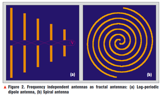 Figure 2 shows a log-periodic antenna and aspiral antenna, both of which can be categorized as fractal antennas.The general concepts of fractals can be applied to develop various antenna elements and arrays. Applying fractals to antenna elements allows for smaller, resonant antennas that are multiband/broadband and may be optimized for gain. Applying fractals to antenna arrays develops multiband/broadband arrays. The fact that most fractals have infinite complexity and detail can be used to reduce antenna size and develop low profile antennas. When antenna elements or arrays are designed with the concept of self-similarity for most fractals, they can achieve multiple frequency bands because different parts of the antenna are similar toeach other at different scales. Application of the fractional dimension of fractal structure leads to the gain optimization of wire antennas. The combination of the infinite complexity and detail and the self-similarity makes it possible to design antennas with very wideband performance. The first application of frac-tals to antenna design was thinned fractal linear and planar arrays [5]-[9], i.e., arranging the elements in a fractal pattern to reduce the number of elements in the array and obtain wideband arrays or multiband performance. An-other advantage of these fractal arrays is that the self-similarity in their geometric structure may be exploited in order to develop algorithms for rapid computation of their radiation patterns. These algorithms are based on convenient product representations for the array factors and are much quicker to calculate than the discrete Fourier transform approach.Cohen [10] was the first to develop an antenna ele-ment using the concept of fractals. He demonstrated that the concept of fractal could be used to significantly reduce the antenna size without degenerating the performance. Puente et al. [11] demonstrated the multi-band capability of fractals by studying the behavior of the Sierpinski monopole and dipole. The Sierpinski monopole displayed a similar behavior at several bands for both the input return loss and radiation pattern.Other fractals [12]-[13] have also been explored to obtain multi-band or ultra-wideband antennas.