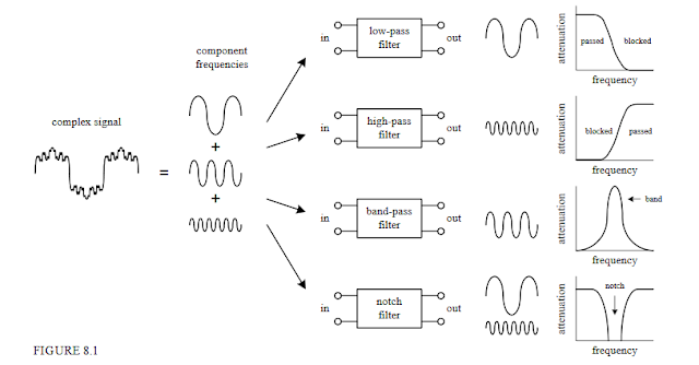 A filter is a circuit that is capable of passing a specific range of frequencies while block-ing  other  frequencies. The  four  major  types  of  filters include low-pass filters, high-pass filters, bandpass filters,and notch filters(or band-reject filters). A low-pass filter passes low-frequency components of an input signal, while a high-pass filter passes high-frequency components. A bandpass filter passes a narrow range  of  frequencies  centered  around  the  filter’s  resonant  frequency,  while  a  notch  filter  passes  all  frequencies  except  those  within  a  narrow  band  centered  around  the  filter’s resonant frequency